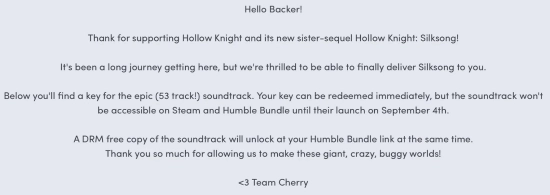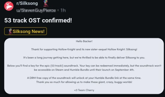 根据推特博主@Daily Silksong News的消息,近日有参与众筹的玩家收到了Team Cherry官方发来的邮件,邮件中确认《丝之歌》的游戏原声集里会收录53首曲目!