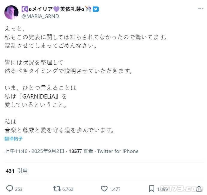 在经历了数小时的茫然无措后,美依礼芽就休团一事发布了正式声明。她坦言自己对这一消息感到十分意外,因为此前并未收到任何关于休团公告的通知。美依礼芽同时表示,她会尽快梳理清楚相关情况,并在合适的时机向公众说明详情。她强调自己始终热爱GARNiDELiA,未来也将继续坚守在守护音乐、尊严与爱的道路上。