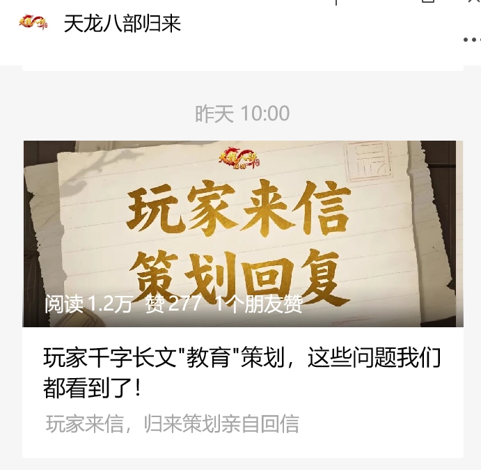 所以,前几天,《天龙八部·归来》端游的官方公众号,居然发布了一篇标题为玩家千字长文“教育”策划的推文,我当时的第一反应是:这难道又是某种标题党式的营销手段?