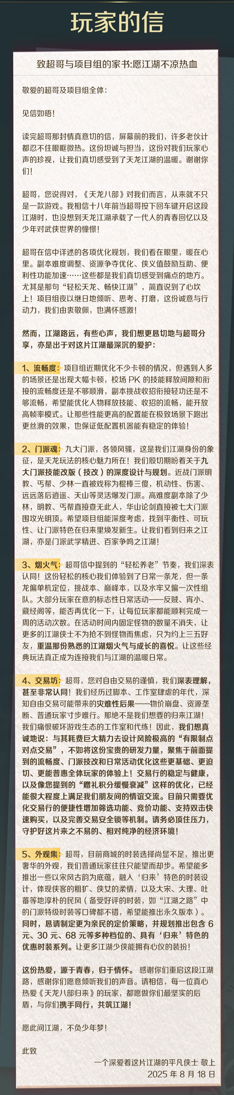 这封信写得确实很棒。字里行间没有丝毫情绪化的宣泄,满是因爱之深切而产生的深刻反思与真挚建言。无论是游戏运行的流畅程度、各门派之间的平衡设定,还是日常玩法里应有的生活气息,几乎把我们这些老玩家共同的心声都一一道尽了。