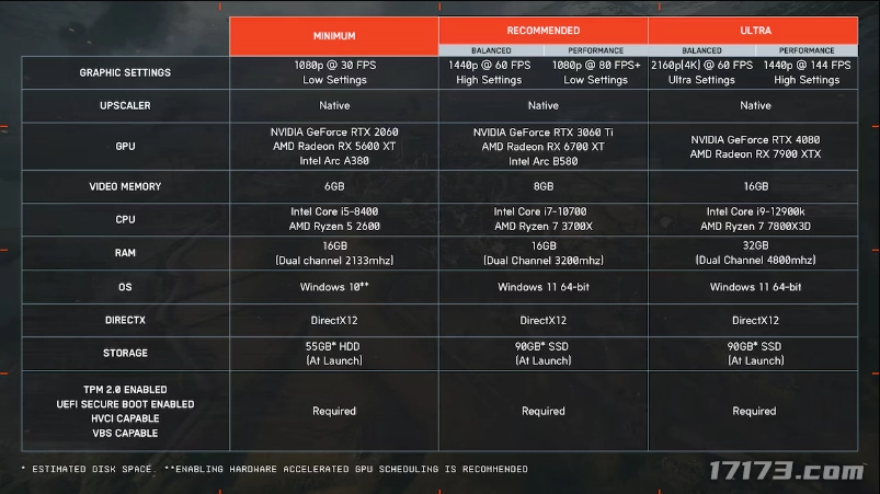 显卡配置要求:NVIDIA GeForce RTX 3060 Ti、AMD Radeon RX 6700 XT 或 Intel Arc B580