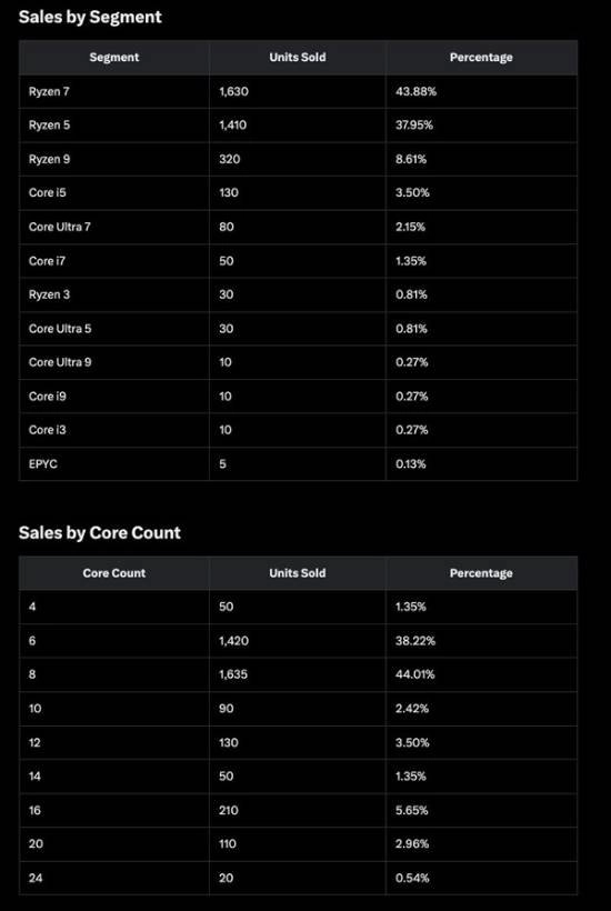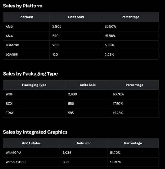 具体型号层面,AMD旗下的锐龙7 9800X3D与7800X3D(二者均为8核配置)颇受玩家喜爱,销量分别达到740颗和250颗;而6核的锐龙5 7600X3D同样表现不俗,单周内售出了680颗。