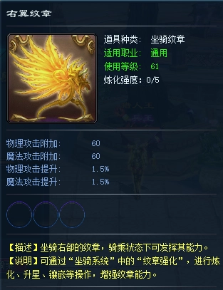 当角色等级提升至61级时,“坐骑纹章”系统也将随之解锁——这是专属于坐骑的装备。处于骑乘状态时,纹章能够为角色带来额外的属性加成。纹章总共分为五个部位,分别是前部、后部、中部、左部和右部,每个部位都有着不同的属性效果。借助炼化与升星这两种方式,还可以进一步增强纹章的属性,打造出独属于你的最强坐骑装备!