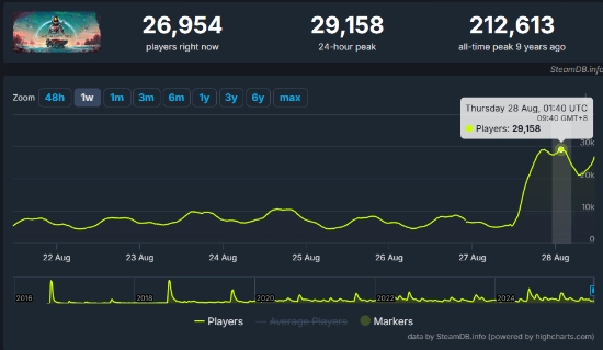 根据SteamDB的数据,《无人深空》的同时在线玩家峰值已回升至2.9万人。目前该作正以4折的优惠力度促销,仅需70元就能入手,还能畅玩九年来推出的所有免费更新内容。