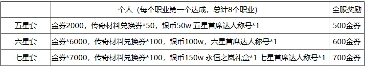当热血谱写传奇,当锋芒划破长空!冲榜巅峰的勇者,以六星套装加冕职业之巅——唯有王者才能驾驭的末世苍龙,此刻便臣服于你。末世苍龙领取规则:活动期间,全服等级率先达到69级且全身集齐完美六星套的前三名玩家,将获得全服唯一的限定坐骑,这份专属荣耀,只属于真正的强者!