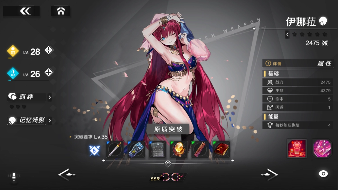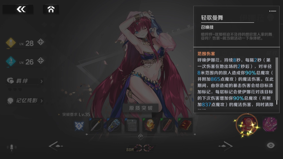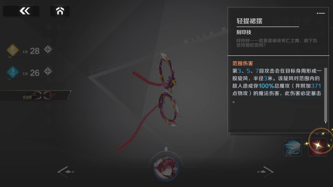 3、武器技能:伊娜菈的SSR武器仅有“哉生既死”这一把,其刻印技为“轻提裙摆”。当使用哉生既死进行第3、5、7段攻击时,会在目标周围生成半径3米的旋风,此旋风能够对范围内的敌人造成伤害。