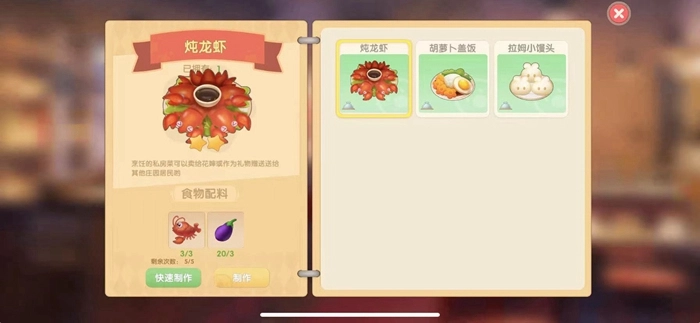 这里既可以选择快速制作,也能直接进行制作。每天的快速制作有次数限制,要是选制作的话,按照系统提示完成点火、翻炒、调味到关火的步骤就行,操作不算复杂,这样就能做出炖龙虾这道料理了。