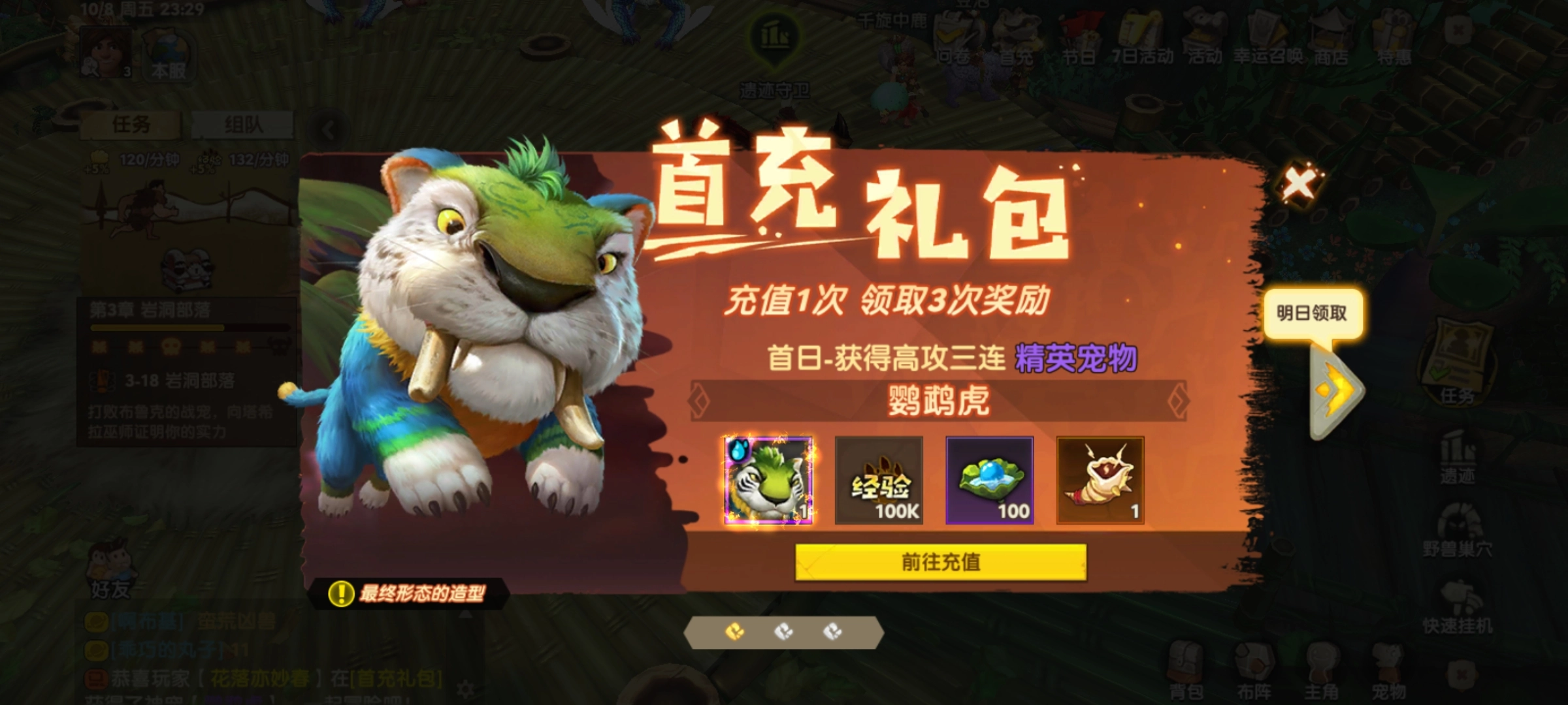 鹦鹉虎可通过首充活动获取:充值任意金额,当日就能领取首充礼包拿到鹦鹉虎,礼包里还有宠物经验、灵泉精华、兽巢号角等材料,正好用来给鹦鹉虎升级;第二天还能领取全套宠物装备给它穿戴。总的来说,通过首充拿鹦鹉虎性价比挺高的。
