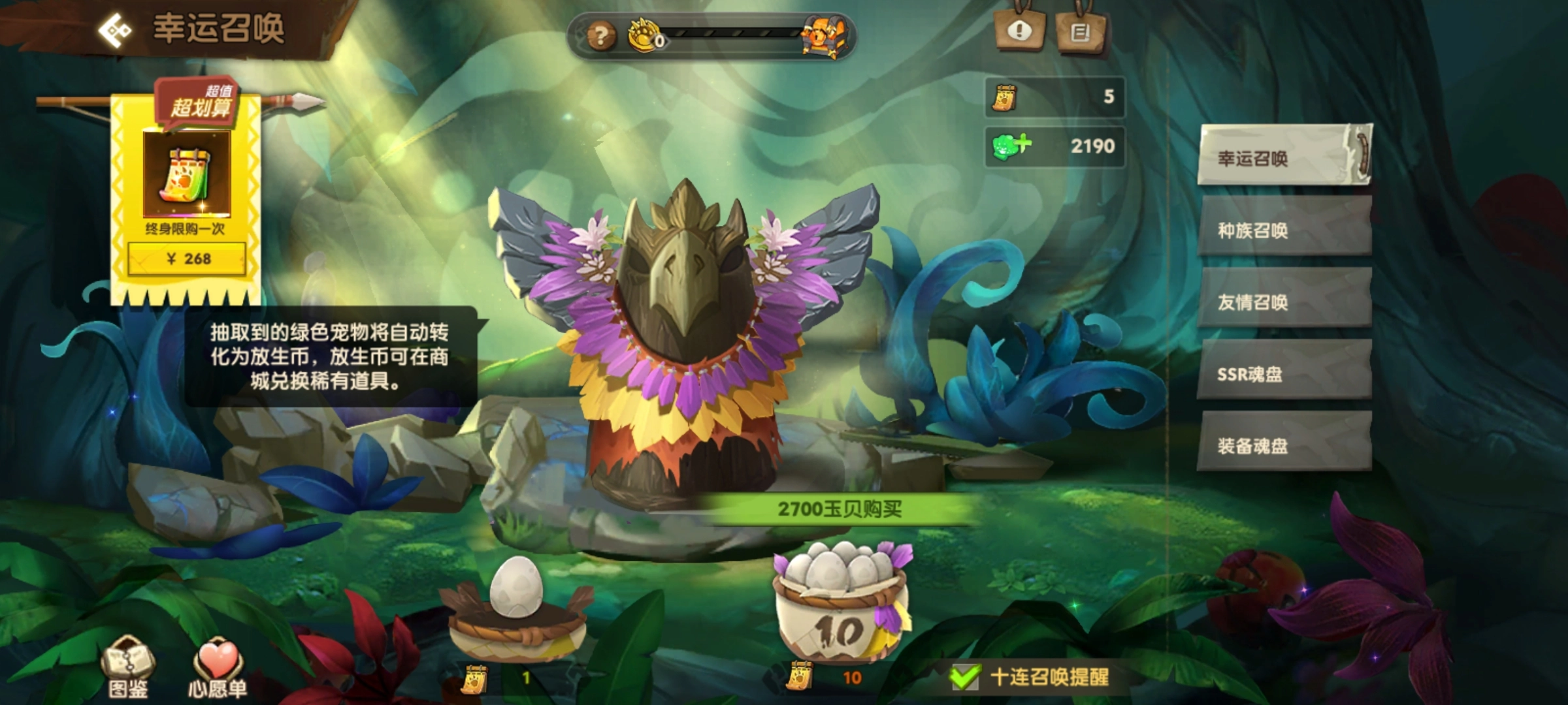 此外,鹦鹉虎还可以通过幸运召唤获取。由于鹦鹉虎属于SR品质的宠物,因此幸运召唤分页下的幸运召唤、种族召唤和友情召唤这三个渠道都能抽到它。幸运召唤券可以从游戏内的活动、任务或副本中获得,也可以直接消耗玉贝购买抽取次数,而玉贝同样能在游戏里获取。
