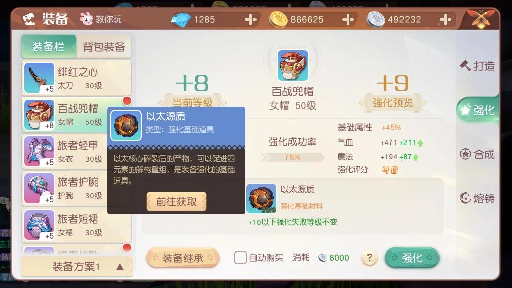 当强化头盔时,一旦等级超过10级,强化失败就会造成装备等级回落。因此在这个阶段,玩家选择的强化材料必须是以太源质,这种道具能显著降低强化失败的概率。