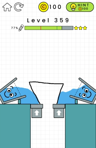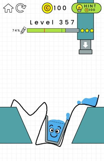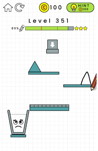 快乐玻璃杯351关依旧很简单,只要在第二块板子上画个三角形挡住水流就可以啦!