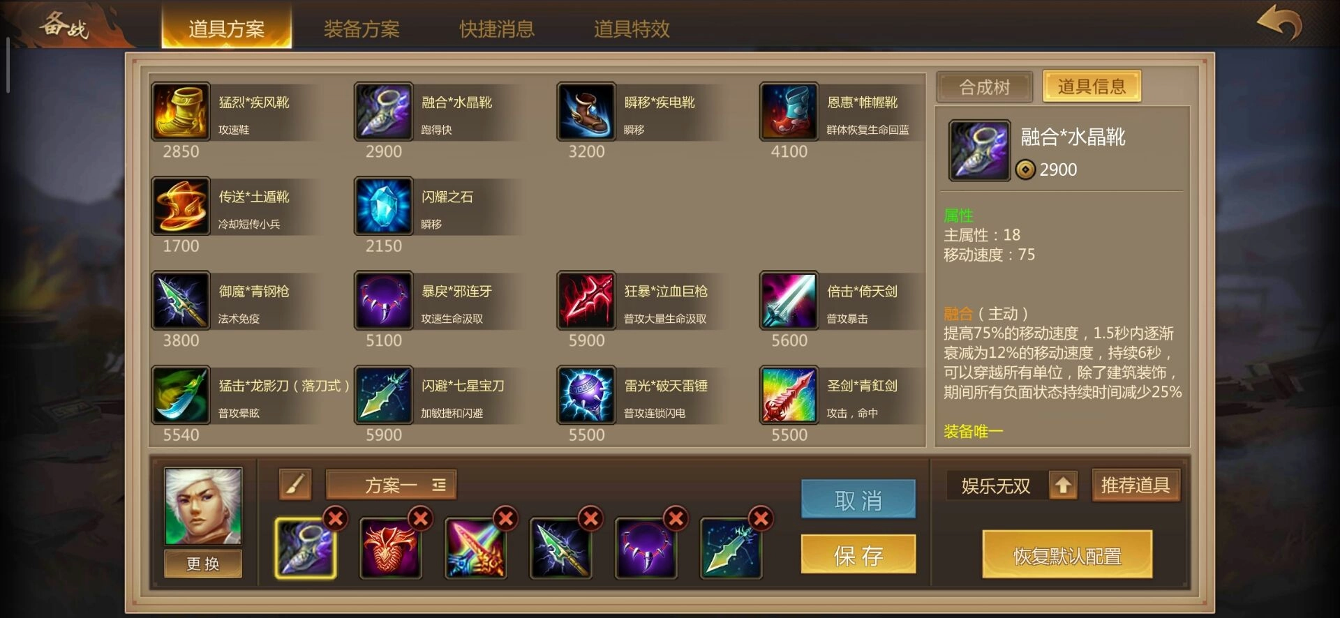 马超的第一件装备推荐出一双水晶鞋,能显著提高移速,还会周期性地赋予他短时间内的高额移速加成与抗性加成。这对马超走位躲避技能,或是在状态不好时快速回城恢复都很有帮助。