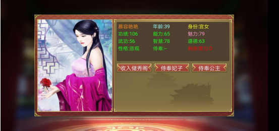每个宫女入府时都自带能力点数,可通过能力培养有概率提升魅力值。因此在正式纳入前,务必先对其进行能力培养。
