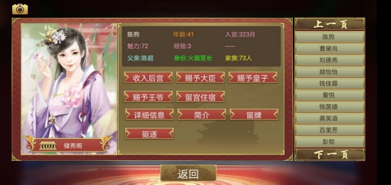 2、玩家前往阁中后,可在秀女列表里找到部分宫女,点击对应人物即可选择让其留宫住宿或直接纳入后宫。若宫女在留宫住宿期间怀孕,系统会自动弹出选项,玩家可选择将其纳入后宫或是赠与他人。(秀女列表内的所有角色均支持上述操作)