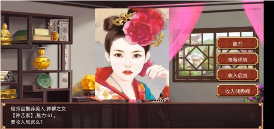 3、阁内除探望、处理秀女外,还能开展“推举美人”玩法——系统会随机生成一位角色(属性与魅力值均不固定)。玩家可选择直接将其纳入后宫,或是先安置在阁中;若选择放入阁中,后续便能在秀女列表里随时对其进行临幸。