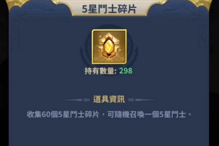 另外,当我们分解重复的英雄时,能够得到斗士碎片。而一旦收集满60个斗士碎片,就可以召唤合成出一名随机斗士。由于童虎在游戏里属于五星斗士,所以只要我们攒够60个五星斗士碎片,打开背包进行召唤,通过这种方式也有相当高的概率获得童虎。