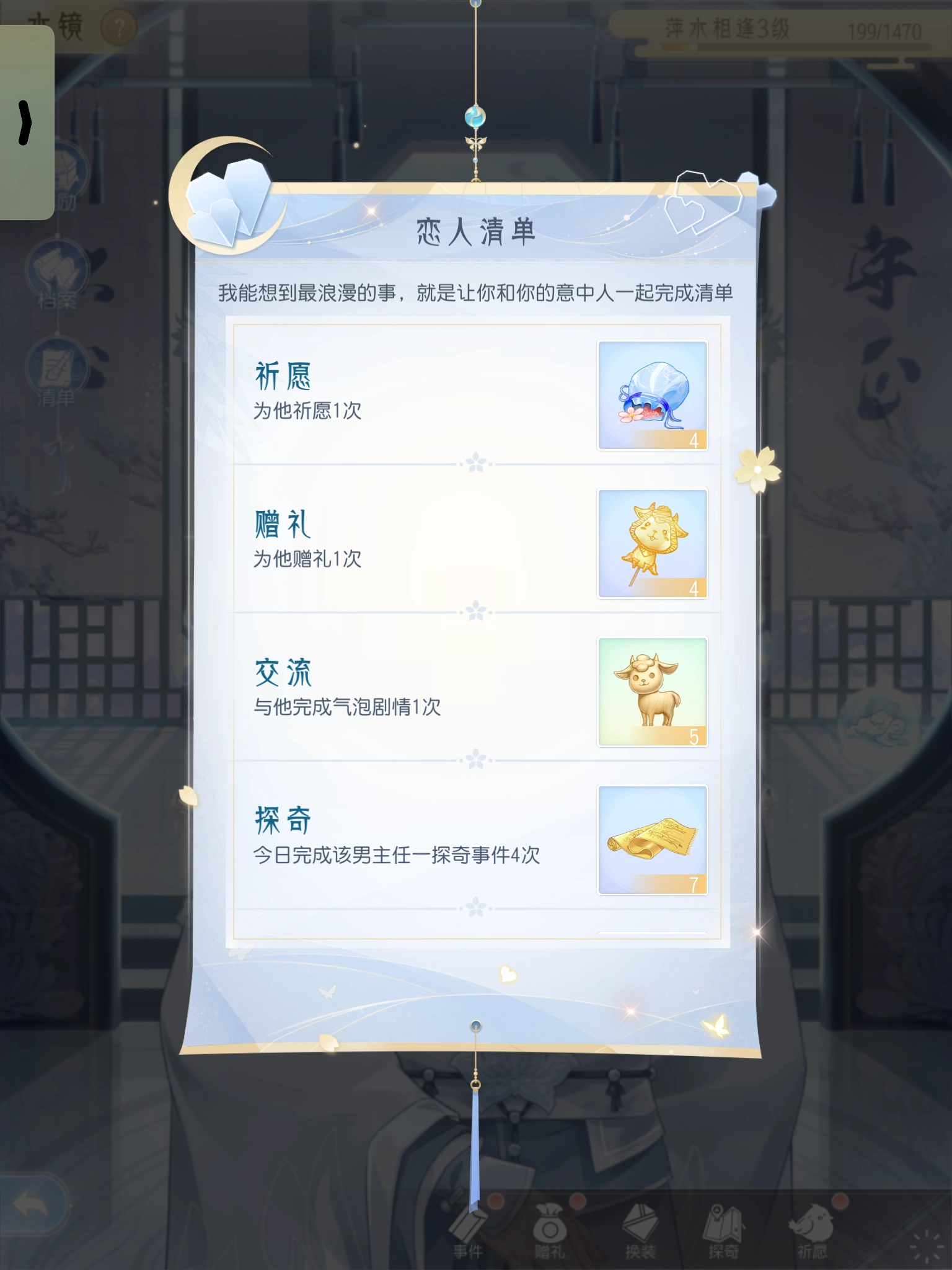 可以为男主在健康、平安与爱情方面祈福,每日可免费进行一次,购买月卡能额外增加一次祈愿机会,每次祈愿可提升200点好感度。