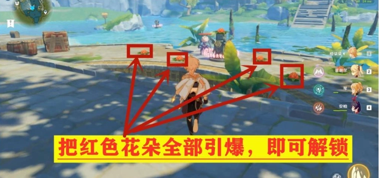 把所有红色花朵踩两遍,它们就会自动爆炸,这样就能解锁图腾,之后用岩元素启动就行。