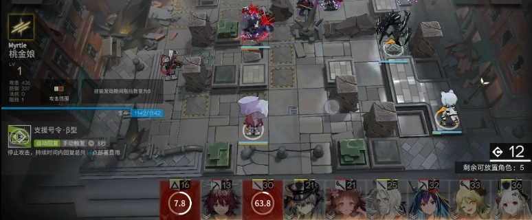 需要注意的是在最后一波时,等塞雷娅快要扛不住即将退场的节点,要及时开启银灰的真银斩,此时把煌替换成史尔特尔,接着让她向左输出即可。