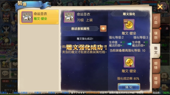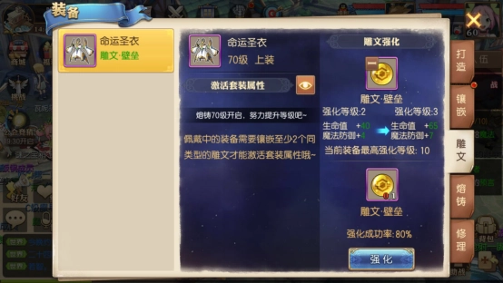 回到主界面后,点击“强化”选项,即可进入强化页面。该页面涵盖打造、镶嵌、雕文、熔铸以及修理等功能。