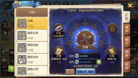 在装备打造界面,系统会依据当前用户的等级展示最新装备。若用户等级为60级,即可查看所有60级对应的装备列表。此外,当用户集齐所需的打造材料并消耗相应数量的银币后,点击“打造”按钮,就能制作出不同类型的装备。