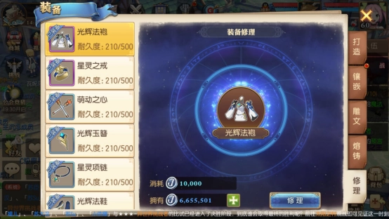 当点击“修理”按钮进入修理页面后,可针对当前角色所穿戴的装备,通过消耗银币来进行修理操作,以此提升装备的耐久度。