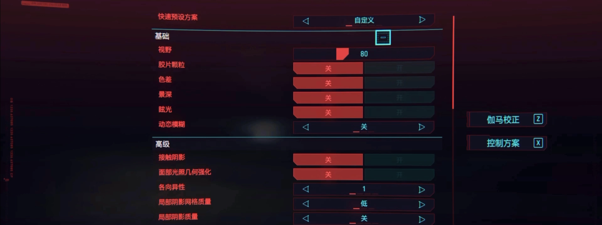 接下来回到游戏里进行相关设置。在基础设置这一栏,我们要把胶片颗粒、色差、景深、眩光和动态模糊这些效果全部关闭,特别是动态模糊,它很容易让画面变得模糊不清,进而影响游戏体验。另外,下方的接触阴影以及局部阴影质量也建议关闭,开启这些功能后通常会导致游戏掉帧严重。