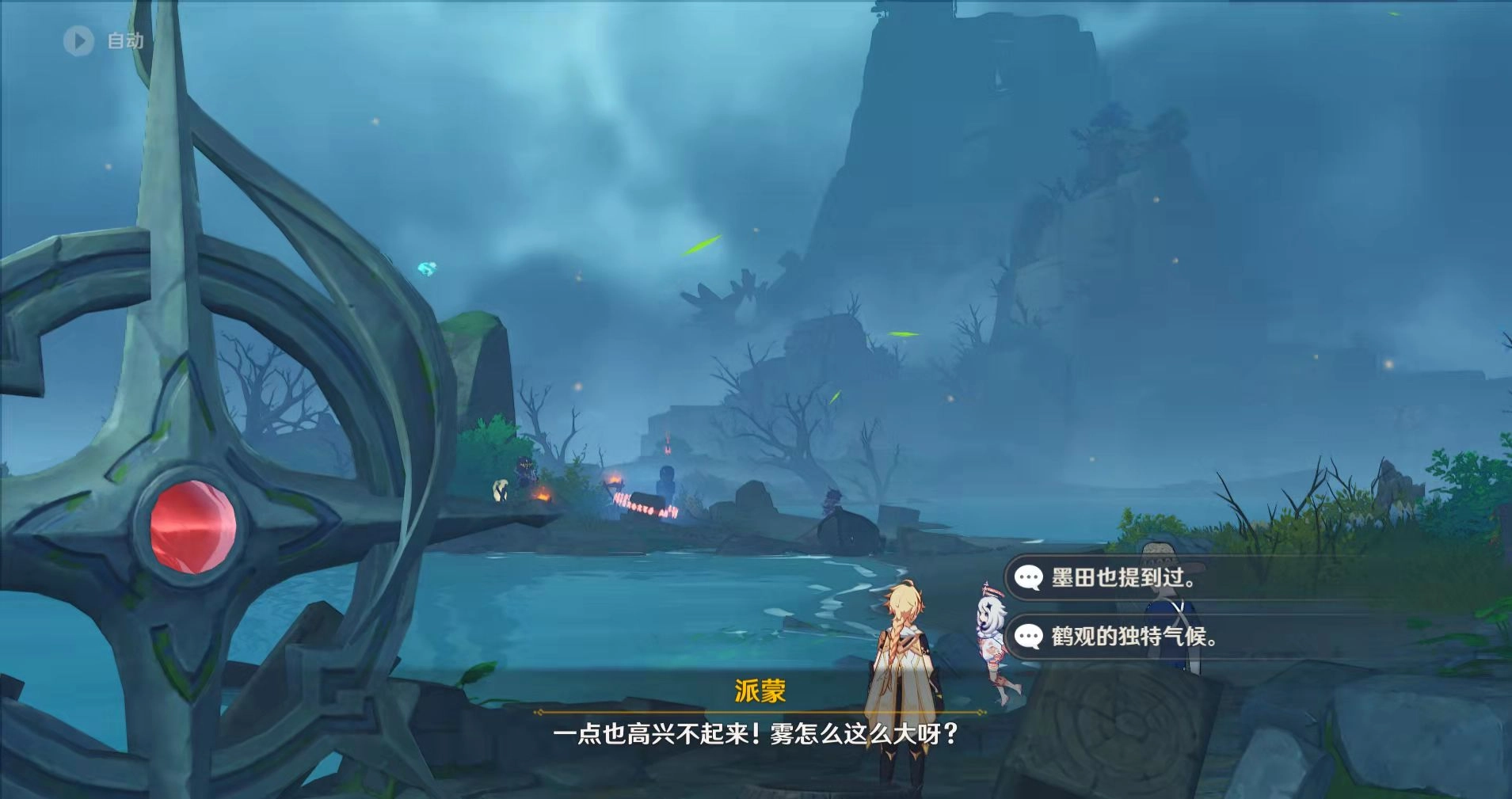 玩家一开始前往鹤观岛得通过一个任务,这个任务需要不少作家参与,完成后就能直接传送到鹤观;那时鹤观岛上到处都是浓雾,连走路都看不清,等做完任务,岛上的迷雾就会消散了。