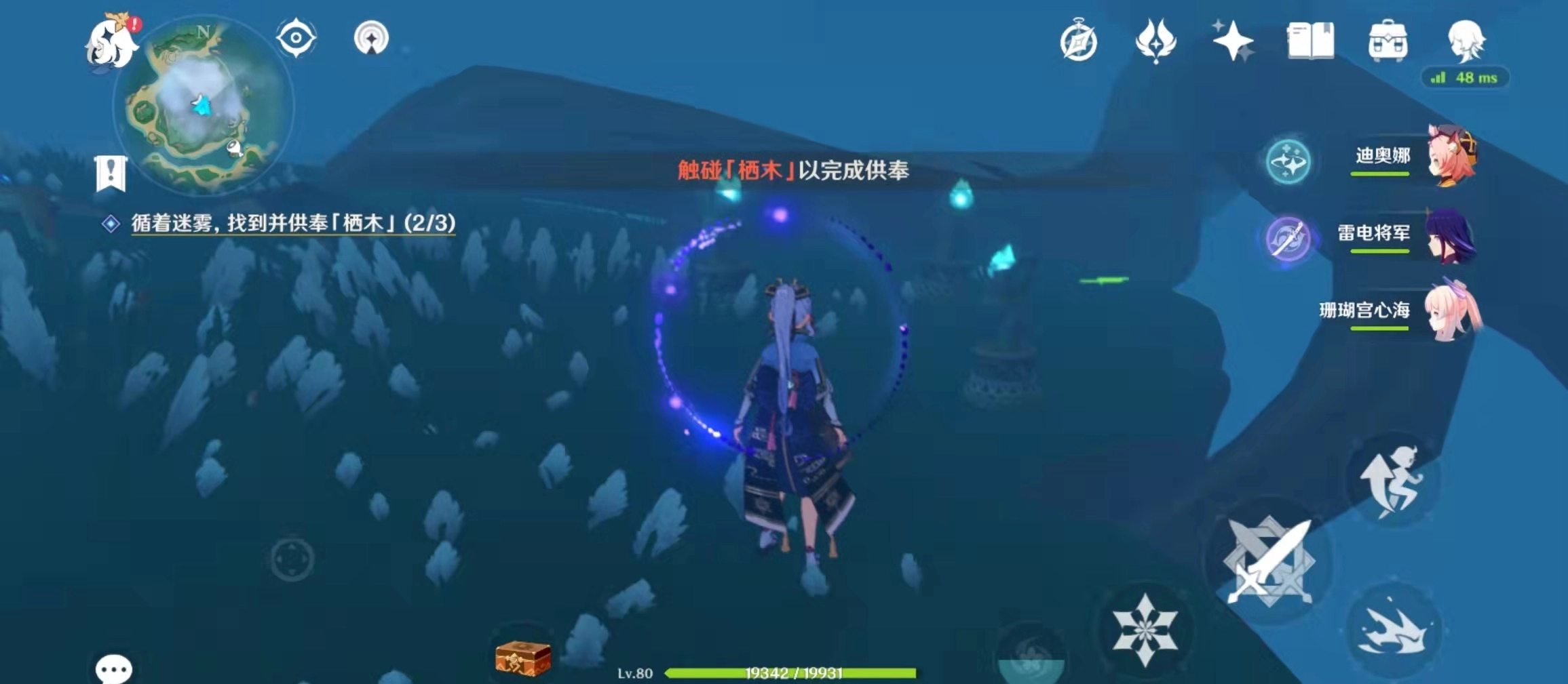 虽然首日的迷雾已然散去,但各位旅行者可别急着放松——当第二天再次踏入游戏,鹤观岛会重新被迷雾笼罩,同时新增一个类似的任务。操作流程与之前大致相同,唯一的区别在于供奉栖木的环节:玩家需要循着元素痕迹找到紫色的团状物体,将其击碎。完成三处这样的位置后,迷雾便会再次消散。