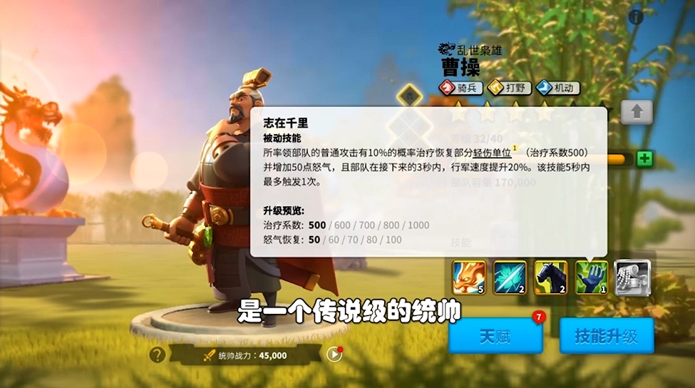 所以说,要是能把曹操的技能点用在正确的方向上,就能同时掌控攻防两端,为部队带来相当不错的伤害加成。因此,如果你玩的是骑兵流,那曹操绝对是你不能错过的英雄。在曹操的天赋技能加点方面,初期最关键的是机动性和打野能力。一开始可以把机动点加到“千里良驹”,毕竟在游戏前期,跑得快是最重要的。觉醒之后,建议先采用5111的加点方式,之后再卡在5252这个节点。等一技能和三技能都拉满了,就可以给曹操升星了。