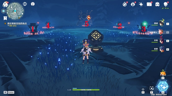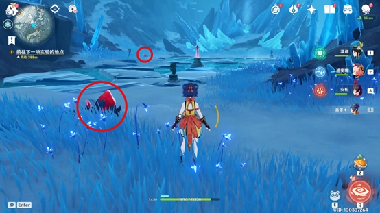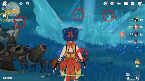 战斗结束后会出现遗迹守卫,大家先把怪物击败,再去周边找石头来打碎片。其中有一块石头藏在雪堆里,位置不固定,建议大家把附近都找一遍。最后一块石头被冰封住了,得找到两个仙灵才行,其中一个仙灵需要开启元素视野才能看到,它就在头顶上。