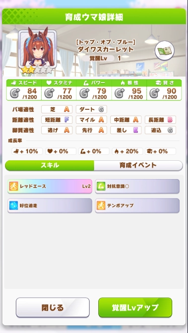 2、长距离方面:由于最终的赛事是长距离类型,所以希望在继承环节能把长距离适应性设定为A。☆哪怕只是单个因素达到要求也能变成A,之后就可以把状态或合适的S作为目标,或者让其继承与性格相契合的稀有技能。