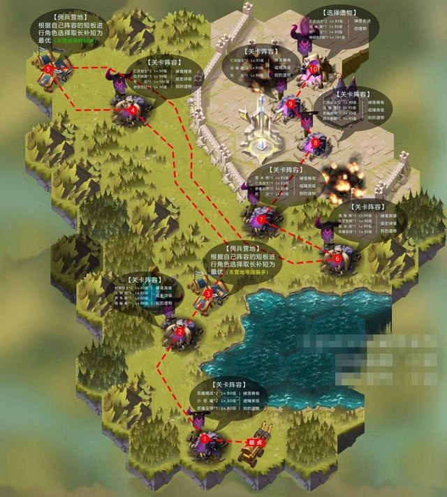 这张图的路线规划很简单:先顺着红线一路推进就行,周边那些给蓝色遗物的营地可以挑几个留着,紫色营地则要全部清理;遗物方面优先找日月冰火、追击号角、银色箭矢这类核心道具,再搭配其他常规遗物就好。要是不打算拿防御类遗物也没关系,毕竟拿了大概率也防不住……
