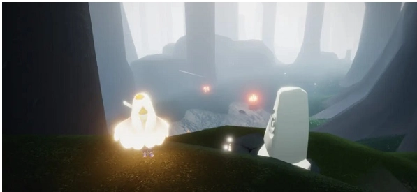 开启后会进入新场景,里面同样有座石亭,玩家直接飞到亭内。接着继续向前飞行,遇到光点时转弯,抵达一处小水潭旁。水潭右侧有个山坡,来到坡上能看到一块石碑。玩家操控角色在石碑前打坐冥想,等石碑完全点亮,冥想任务就完成了。