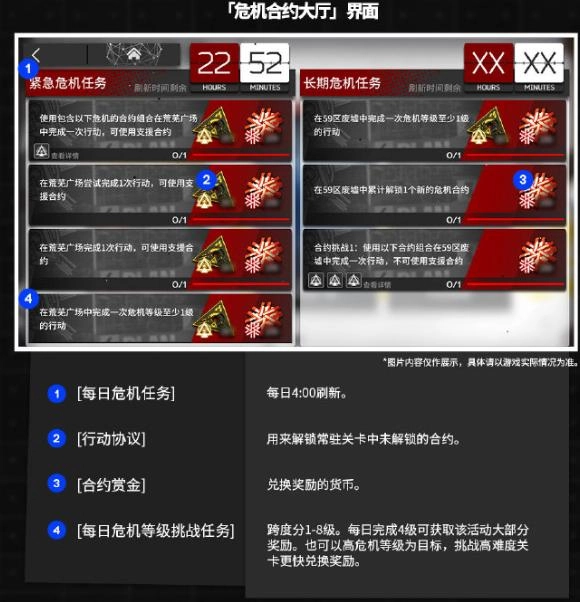 危机合约大厅为宣布活动活动的页面,活动经过通过关卡做完。