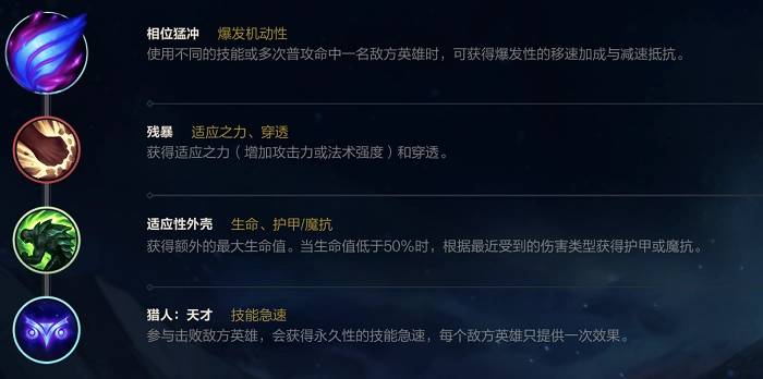 首先来聊聊符文的选择建议,由于提莫的核心输出方式是QA连招的爆发伤害,所以主系符文可以考虑电刑或者相位猛冲——电刑的优势在于能提供更高的瞬间伤害,而相位猛冲则可以增强提莫的持续输出能力,具体选择需要结合敌方阵容的位移技能数量来判断。 接下来是副系符文,推荐选择残暴、适应性外壳和猎人天才。可能有人会问,为什么最后一个选猎人天才而不是战略家?这是因为虽然提莫前期需要带动节奏,但到了后期,技能冷却时间才是更关键的点,选择猎人天才才能在后期换取最大的收益。