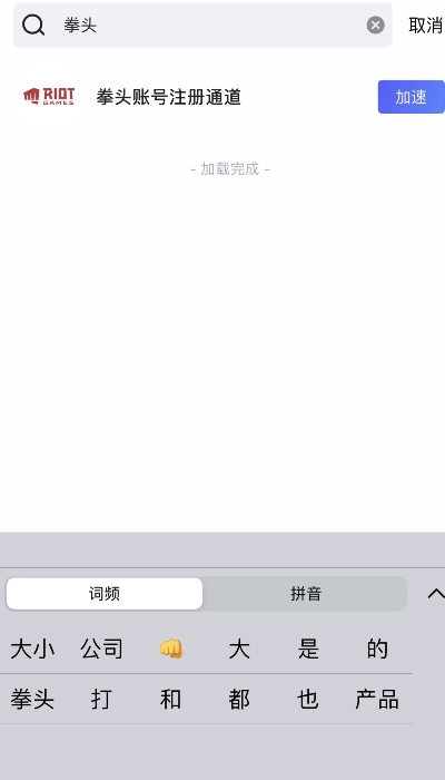 2.打开biubiu加速器搜索“拳头账号”,点击加速。