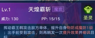 挥舞霸王戟攻击单个敌人,可提升自身物防或魔防一级;若在出手前受到攻击,则额外触发一次增益效果并嘲讽目标。不过,初始提升物防与魔防的随机性会削弱该技能的实用性,而需先手攻击才能触发的第二个特效,在实战中往往并非有利局面。