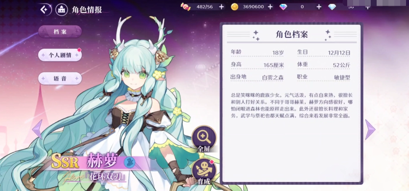 作为一位总是面带笑容的鹿族少女,赫萝性格元气满满又活泼开朗,还有点自来熟,特别擅长和他人快速打成一片。和哥哥赫莱不同,她的方向感极好,就算闭着眼睛走进森林,也能丝毫不差地原路返回。除此之外,她在料理和家务上也十分拿手,武学与祭祀方面更是天赋出众,综合来看,赫萝的发展可谓相当全面。不过她也有个小缺点——是个话痨少女,而且最擅长讲鬼故事,所以小伙伴们晚上一起玩的时候,最好别选她哦。