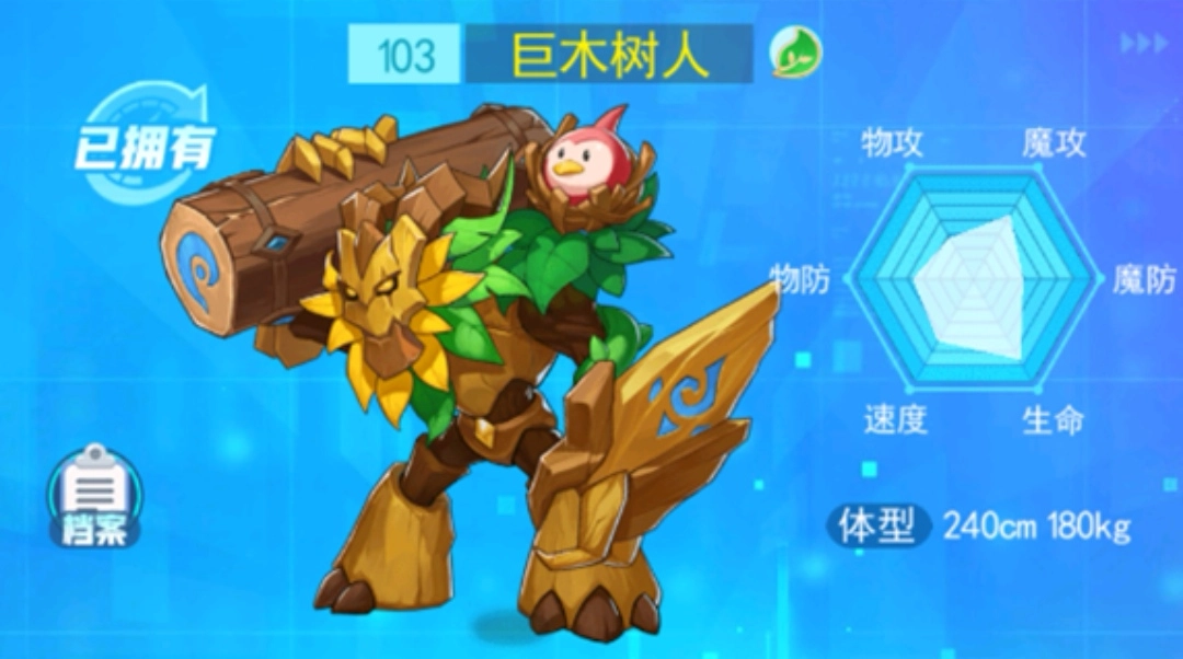 巨木树人推荐的性格为保守,努力值建议分配给特攻与速度。适合它的技能组合是慈悲为怀、飞叶斩、护盾护体和狂暴拳法。此外,巨木树人是非常适合抓捕稀有精灵的宠物,因为它的慈悲为怀技能能够为稀有精灵保留最后一滴血。