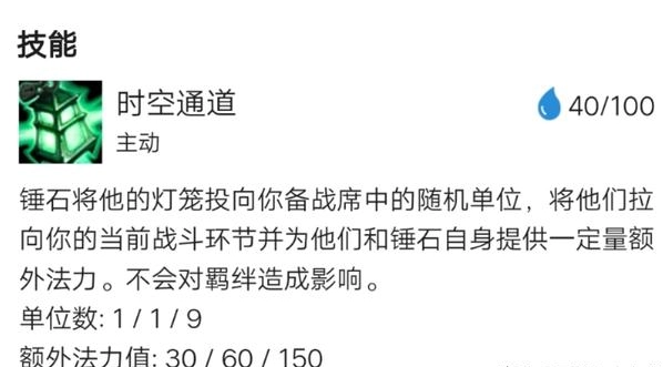 锤石的核心机制是通过技能“时空安全通道”把备战区的棋子拉到场上作战,以此改变战场格局,从而有效强化阵容的防御、控制与恢复能力。2星锤石的总蓝量只有90点,释放技能后还会额外获得60点法力值。所以我们给它出炽天使之拥,这样它放完技能就能立刻回20点蓝,再补一下平A又能再次放技能,就能快速把备战区的棋子全拉上场,让阵容的防御、控制和恢复能力得到大幅提升!