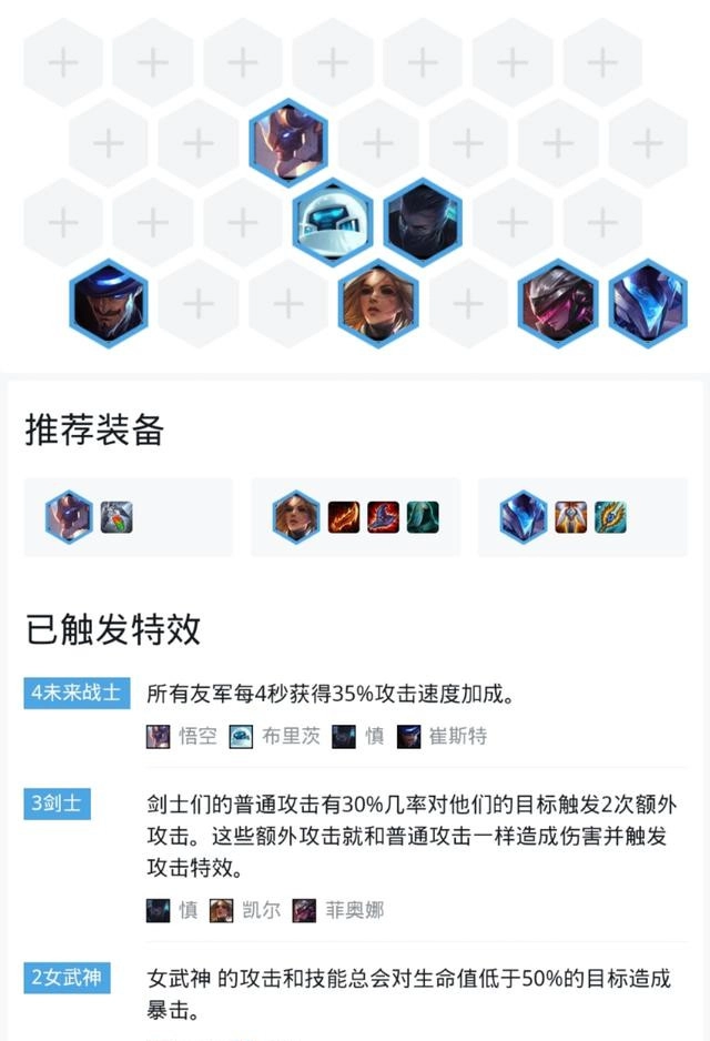 咱们在为阵容选择未来战士英雄的时候能够摒弃没羁绊加成的凯特琳,选用其它6名未来战士英雄激活羁绊,其它6名未来战士在享用巨额的攻击速度加成的时候也可以为阵容搞出非常厉害的伤害/掌控特效。