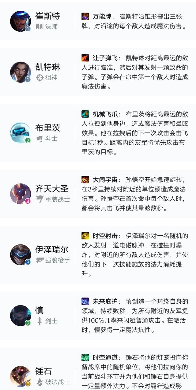 锤石拉入对决的英雄不会对羁绊带来伤害,因此咱们尽可能遴选单体得到群体掌控/群体恢复的英雄放到备战区,让锤石拉的英雄保证“物尽其用”。