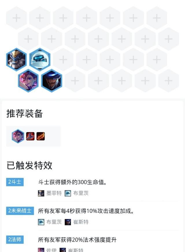早期咱们借助低费未来战士中的崔斯特、智能人构成未来战士羁绊,与此同时搭配佐伊、墨菲特激活斗士、法师羁绊,如此阵容在早期就得到法师输出羁绊与斗士防御羁绊的攻防联合系统,并且未来战士还可以不停为英雄带来攻击速度,确保阵容在早期就比较强力,为后续阵容发展拿下优越的经济基础。