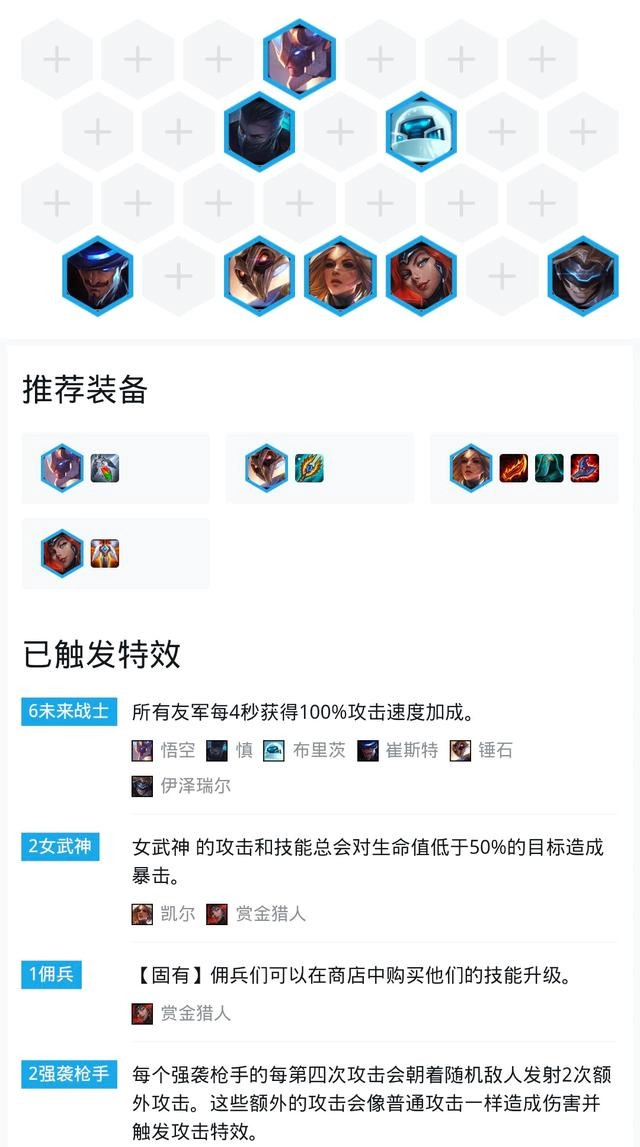后期咱们寻找5费未来战士卡片锤石后就能激活6未来战士羁绊,为全部友军带来巨额攻击速度,与此同时将女武神卡莎更换为厄运小姐,进而接着提高阵容输出质量。