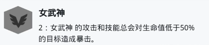 女武神:就地上存留2名及以上女武神的时候,女武神的攻击和技能总会对血量少于50%的指定目标带来爆击。