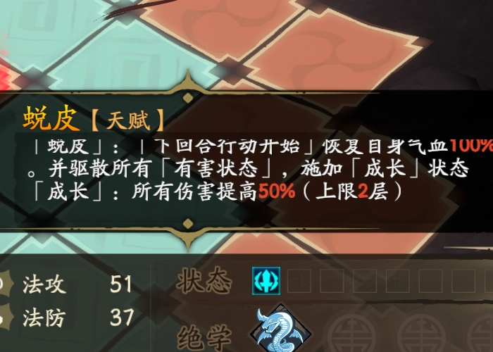 玩家使用的角色是化蛇,它的天赋为蜕皮。当化蛇完成蜕皮后,生命值会恢复至满值,身上的有害状态会被驱散,伤害也会得到提升。玩家需要让化蛇踩到蚀斑,使其获得有害状态,这样就能触发化蛇的蜕皮天赋了。