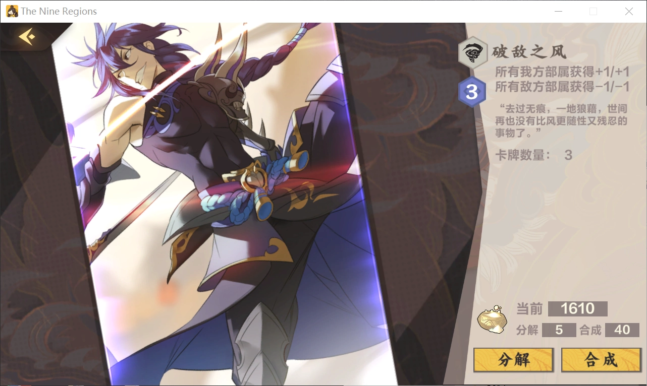 破敌之风的效果是:使用后敌方会减少一张手牌,我方则增加一张手牌,通常在升级后用来针对敌方的手牌进行克制。