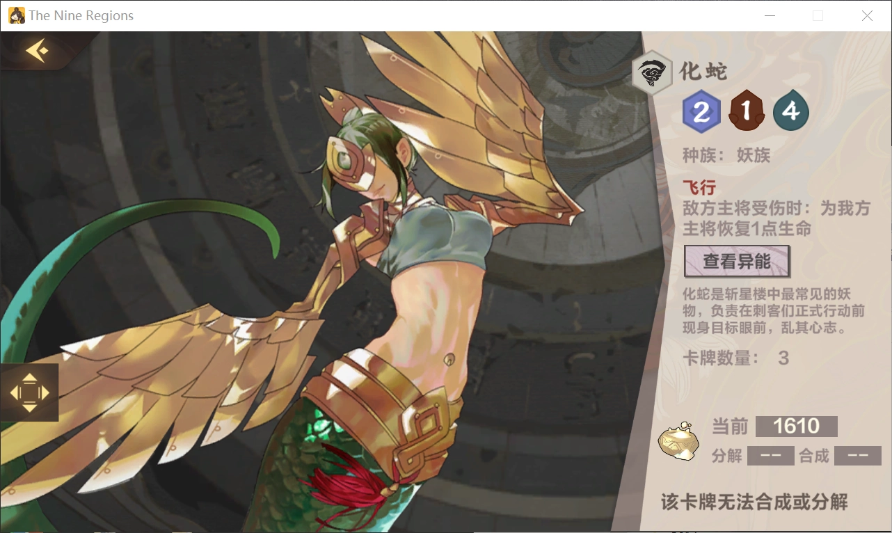 化蛇:当敌方主将受伤时,我方主将将恢复一点生命值,若与飞行牌搭配使用,能发挥出意想不到的绝佳效果。