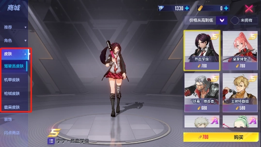 3、皮肤:这里包含驾驶员皮肤、机甲皮肤、枪械皮肤和载具皮肤这几类,大家可以根据自身需求进行选购。